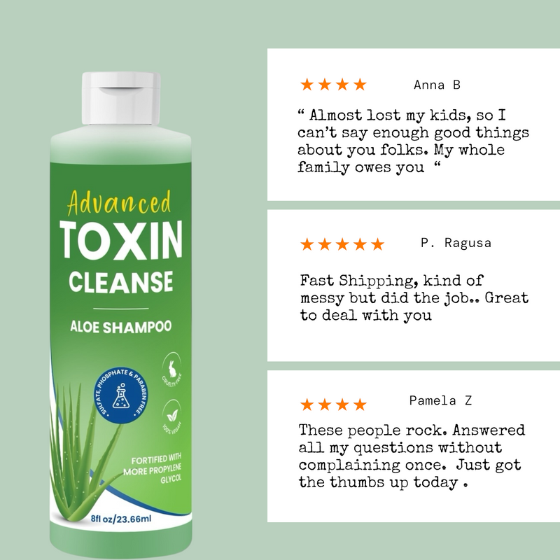 1) Our Advanced Toxin Cleanse drug detox shampoo features an enhanced formula with a higher concentration of propylene glycol, the key active ingredient for effectively penetrating hair shafts.